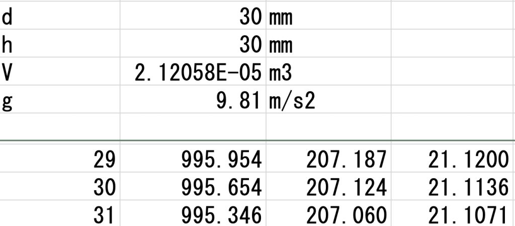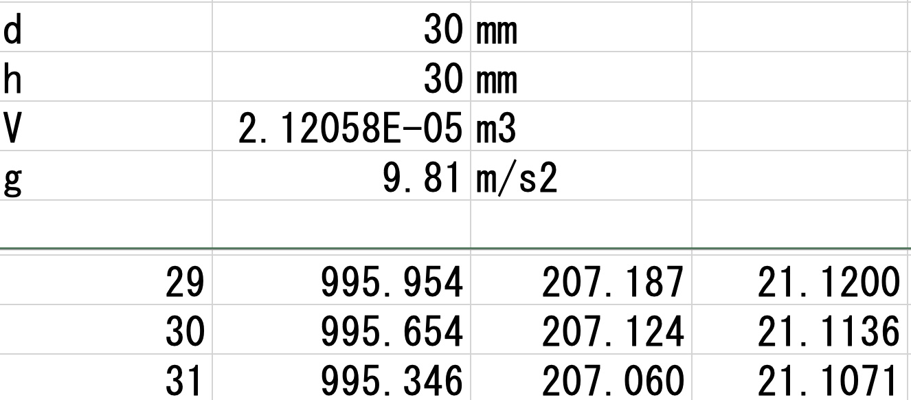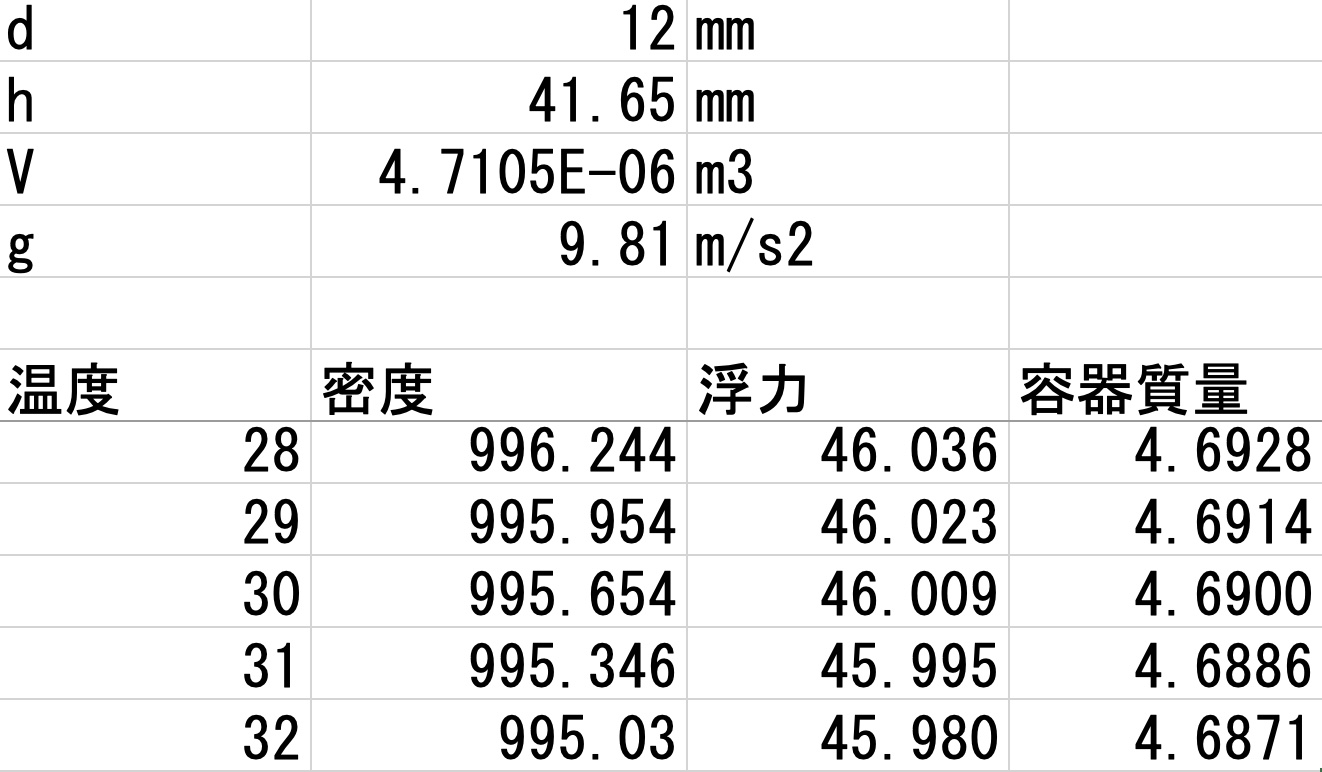 2023-02-10 / 最終更新日時 : 2025-02-16 コニー 物理や化学 難しいガリレオ温度計の製作 3週間前からガリレオ温度計を製作しているスクール生。 重りの質量を4.68g、水温31.5℃で釣り合うか? → 挑戦したがとても難しい。 そこで、コニーが浮力の計算をして、生徒と検討してみました。 なんと、温度差1℃は、0.001gに相当することが判明しました。 大きさ30mmで製作すれば、0.01gの調整でいけるね!と・・・